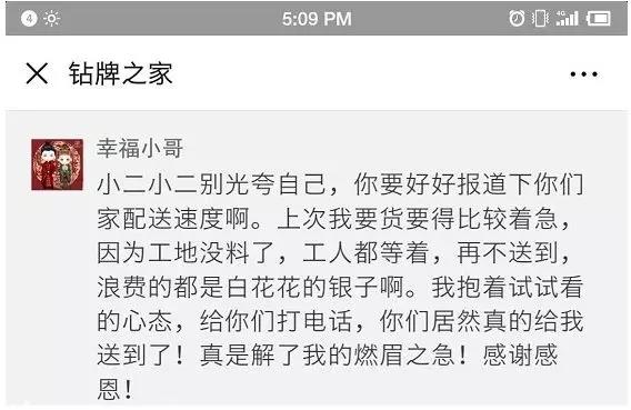 “幸福小哥”則留言稱,對鉆牌之家配送速度相當(dāng)滿意。確實,如果工人等著干活,卻沒有材料是一件很捉急的事情,給鉆牌之家打電話,居然真的送到了,真是雪中送炭。