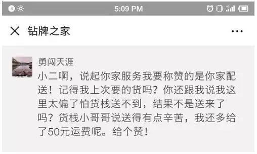 “勇闖天涯”說“說起你家服務(wù)我要稱贊的是,你家配送,記得我上次要的貨,你還跟我說這里太偏了怕貨棧送不到,結(jié)果還是送到了,貨棧小哥真的很辛苦,給個贊。”