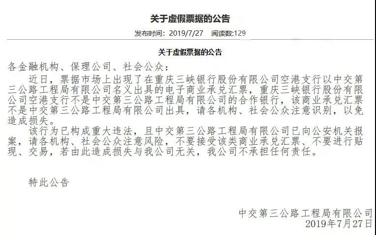 中交第三公路工程局有限公司已向公安機關(guān)報案,并發(fā)公開發(fā)通知提醒機構(gòu)、社會公眾注意風(fēng)險,不要接受該類商業(yè)承兌匯票、不要進(jìn)行貼現(xiàn)、交易。公告原文如下: