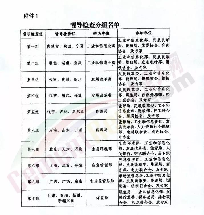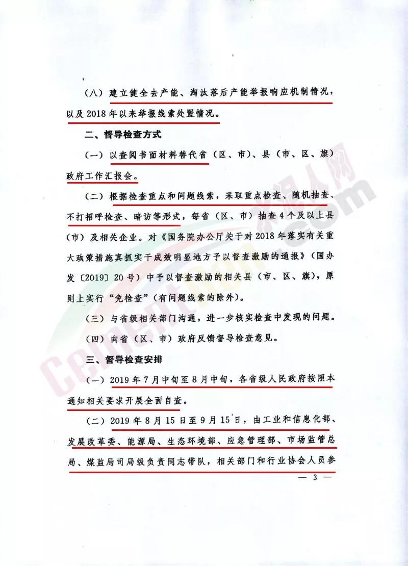 通知督導(dǎo)檢查重點包括2016年以來建設(shè)或確認的鋼鐵、煤炭、水泥、平板玻璃、電解鋁項目落實產(chǎn)能置換情況。重點是產(chǎn)能置換方案、項目備案文件、被置換的產(chǎn)能(設(shè)備)是否如期退出、相應(yīng)建設(shè)項目進展情況。 2018年執(zhí)行能耗、環(huán)保、質(zhì)量、安全、技術(shù)等法規(guī)標準,依法依規(guī)淘汰落后產(chǎn)能情況;2019年淘汰落后產(chǎn)能工作方案制定情況。 2018年以來去產(chǎn)能、淘汰落后產(chǎn)能職工安置情況,以及差別化價格等相關(guān)政策落實情況。建立健全去產(chǎn)能、淘汰落后產(chǎn)能舉報響應(yīng)機制情況,以及2018年以來舉報線索處置情況 。 督查檢查方式包括以查閱書面材料代替政府工作匯報會;根據(jù)檢查重點和問題線索,采取重點檢查、隨機抽查不打招呼檢查、暗訪等形式。對《國務(wù)院辦公室關(guān)于對2018年落實有關(guān)重大政策措施真抓實干成效明顯地方予以督查激勵的通報》中予以督查激勵的相關(guān)縣(市、區(qū)、旗),原則上實行“免檢查”。 督查檢查安排7月中旬至8月中旬各省級人民政府按照本通知相關(guān)要求開展自查。8月15日至9月15日,由工業(yè)和信息化部、發(fā)展改革委、能源局、生態(tài)環(huán)境部、應(yīng)急管理部、市場監(jiān)督總局、煤監(jiān)局司局級負責(zé)同志帶隊,相關(guān)部門和行業(yè)協(xié)會人員參加,組成10個聯(lián)合督導(dǎo)檢查組,開展實地督查檢查。具體時間由各督導(dǎo)檢查組對接確定。