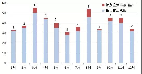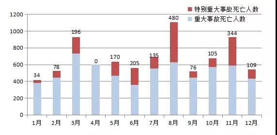 其中,特別重大事故在近十年的8月份發(fā)生最為集中,共發(fā)生8起、死亡480人,占近十年特別重大事故起數(shù)、死亡人數(shù)的20.0%、24.8%;分別比全年月平均值高出11.7和16.5個百分點(diǎn),在12個月份中均位列第一位。