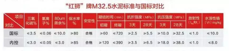 紅獅水泥江西、四川、福建等區(qū)域先后推出M32.5新品,其新品所使用的熟料、石膏、混合材品種與“紅獅”牌P.C32.5水泥一致,質(zhì)量穩(wěn)定 ,富裕強(qiáng)度高,具有需水量少、泌水性小、保水率高等優(yōu)點(diǎn),水泥色澤一致,配置的混凝土體積穩(wěn)定性好,可廣泛用于砌筑,抹面砂漿、墊層及配置C25以下普通混凝土。“紅獅”牌M32.5水泥標(biāo)準(zhǔn)與國際對比數(shù)據(jù)如下: