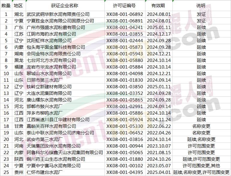 2019年8月第一批水泥生產(chǎn)許可證名單