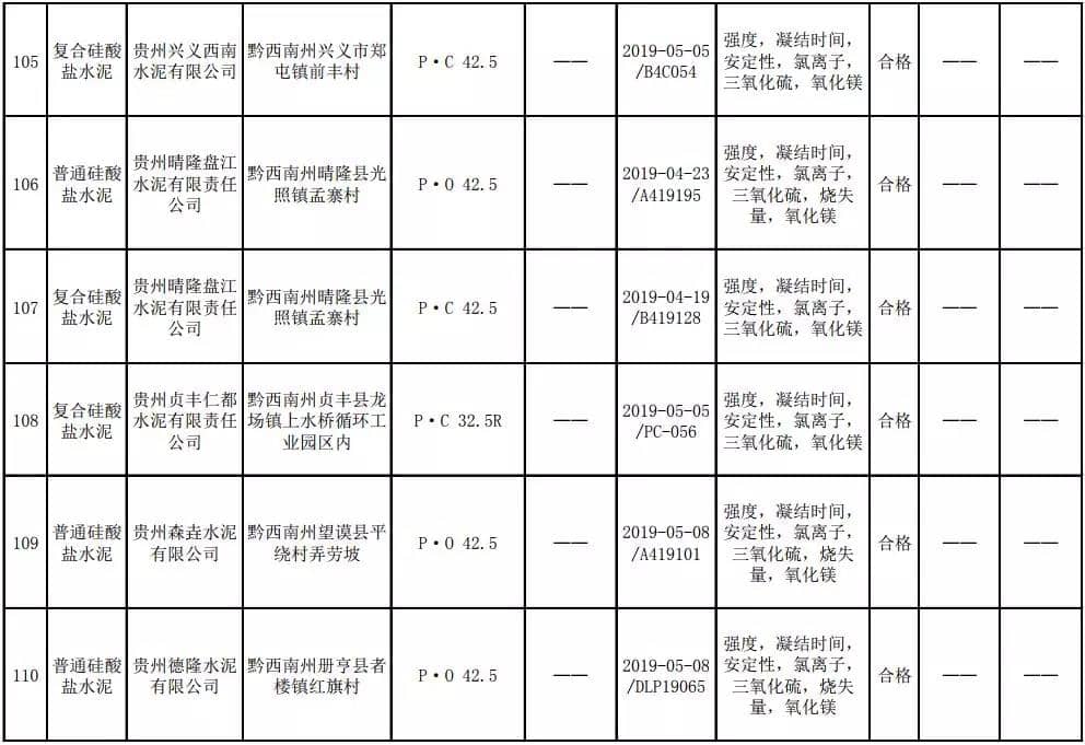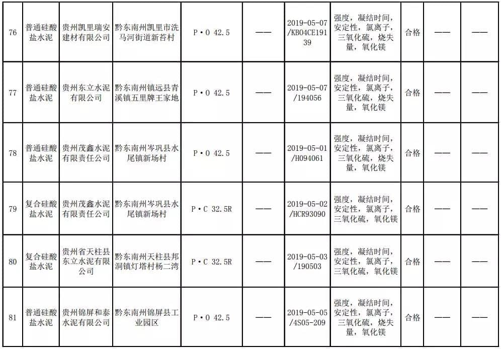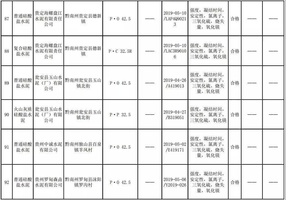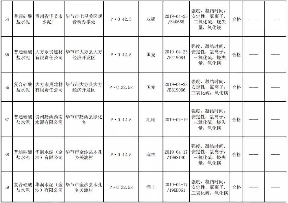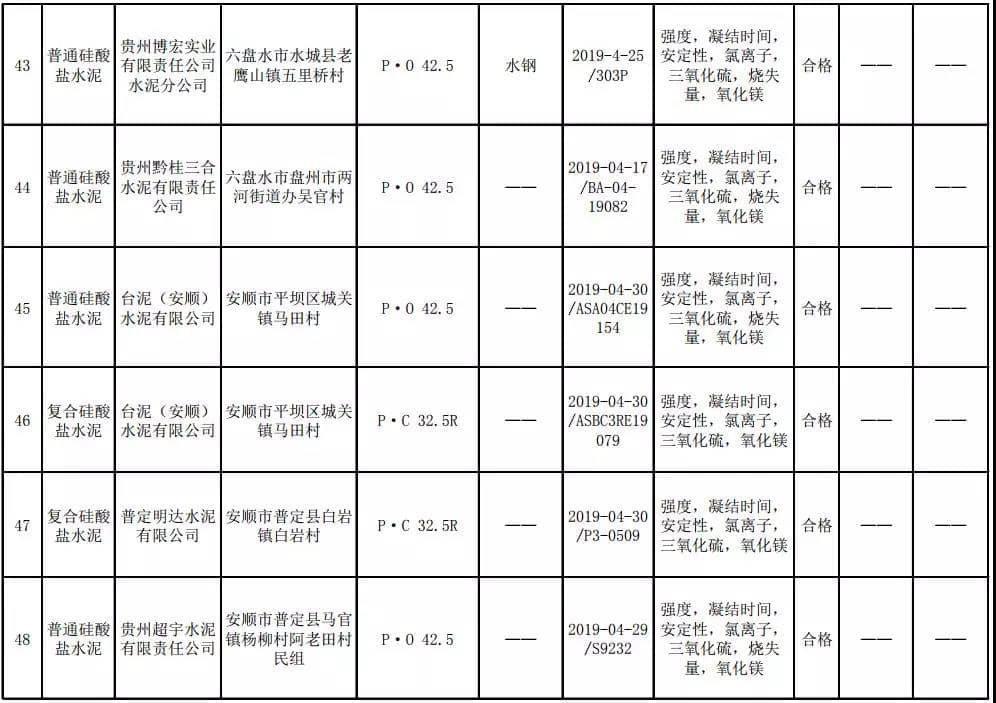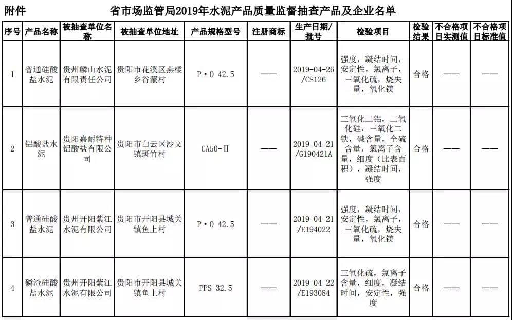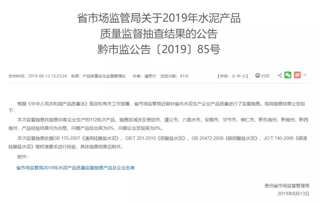 2019年8月13日,貴州省市場監(jiān)督管理局網(wǎng)站公布2019年水泥產(chǎn)品質(zhì)量監(jiān)督抽查結(jié)果。本次監(jiān)督抽查共抽查90家企業(yè)生產(chǎn)的112批次產(chǎn)品,抽查區(qū)域涉及貴陽市、遵義市、六盤水市、安順市、畢節(jié)市、銅仁市、黔東南州、黔南州、黔西南州,產(chǎn)品檢驗(yàn)結(jié)果均為合格,問題產(chǎn)品檢出率為0%,問題企業(yè)發(fā)現(xiàn)率為0%。