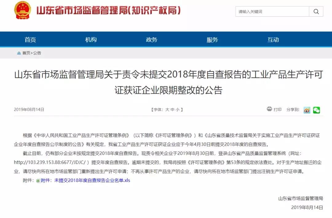 日前,山東省市場監(jiān)督管理局發(fā)布公告文件稱:根據(jù)《中華人民共和國工業(yè)產(chǎn)品生產(chǎn)許可證管理條例》(以下簡稱《許可證管理條例》)和《山東省質(zhì)量技術(shù)監(jiān)督局關(guān)于實施工業(yè)產(chǎn)品生產(chǎn)許可證獲證企業(yè)年度自查報告公示制度的公告》有關(guān)規(guī)定,山東省工業(yè)產(chǎn)品生產(chǎn)許可證獲證企業(yè)應(yīng)于今年4月30日前提交2018年度的自查報告。