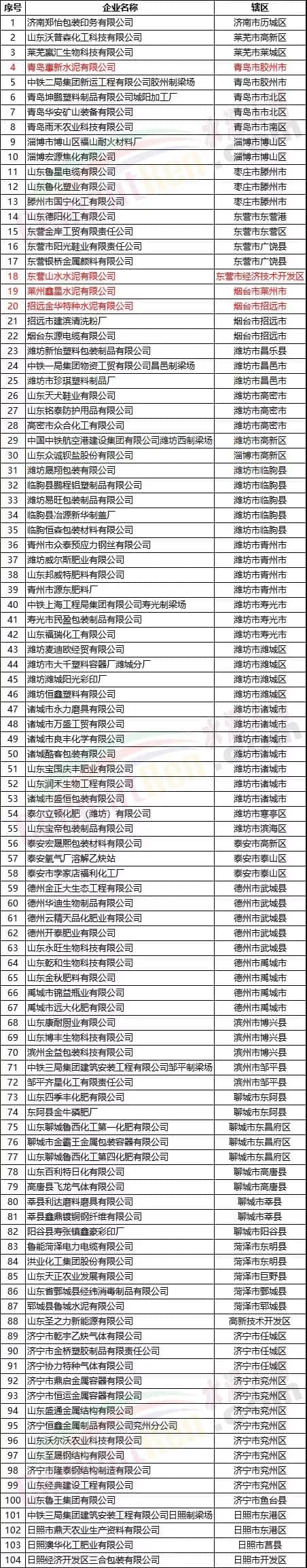 截止目前,仍有青島惠新水泥有限公司、東營山水水泥有限公司、萊州鑫星水泥有限公司、招遠(yuǎn)金華特種水泥有限公司等水泥企業(yè)在內(nèi)的部分企業(yè)未按規(guī)定提交2018年度自查報告。