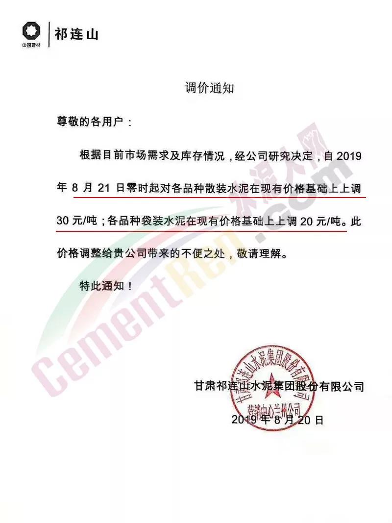 其中甘肅祁連山水泥集團股份有限公司營銷中心蘭州公司調(diào)價通知稱自8月21日零時起對各品種散裝水泥在原有價格基礎上上調(diào)30元/噸;各品種袋裝水泥在現(xiàn)有價格基礎上上調(diào)20元/噸。