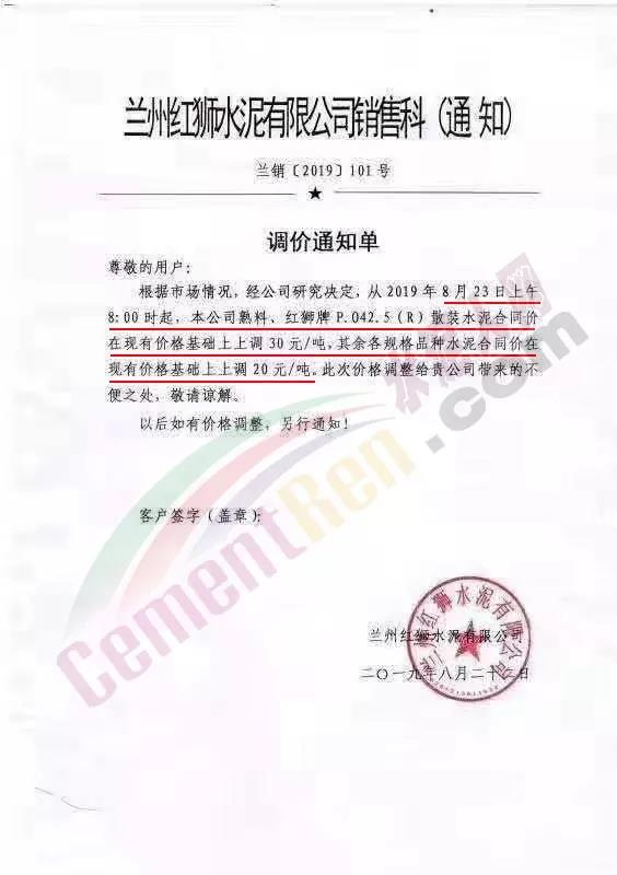 蘭州紅獅水泥有限公司銷售科調(diào)價通知稱,自8月23日上午8時起,公司熟料、紅獅牌P.O42.5(R)散裝水泥合同價在現(xiàn)有價格基礎上上調(diào)30元/噸。其余各規(guī)格品種水泥合同價在現(xiàn)有價格基礎上上調(diào)20元/噸。