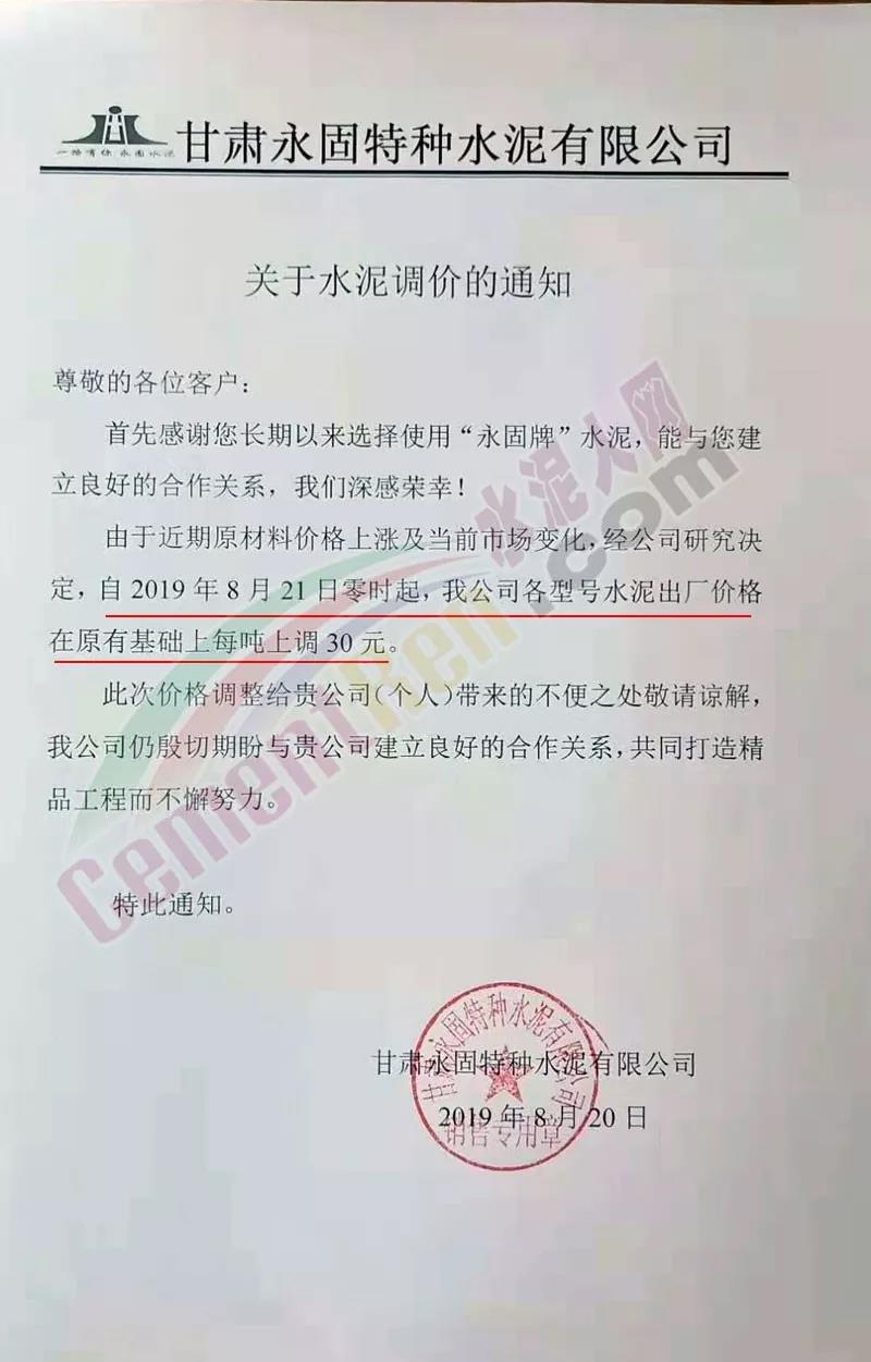 甘肅永固特種水泥有限公司《關于水泥調(diào)價的通知》稱,由于近期原材料價格上漲及當前市場變化 ,經(jīng)公司研究決定 自8月21日零時起,公司各型號水泥出廠價格在原有基礎上每噸上調(diào)30元/噸。