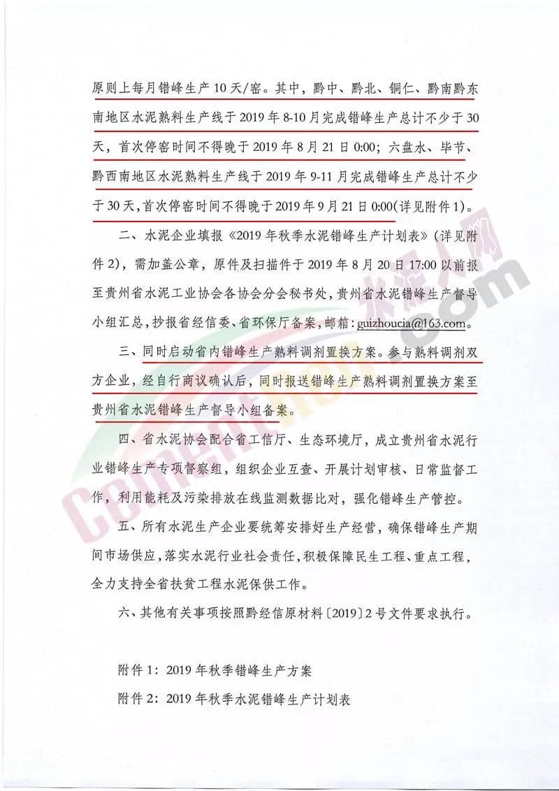 其中,黔中、黔北、銅仁、黔南黔東南地區(qū)水泥熟料生產(chǎn)線于2019年8-10月完成錯峰生產(chǎn)總計不少于30天,首次停窯時間不得晚于2019年8月21日0:00;六盤水、畢節(jié)、黔西南地區(qū)水泥熟料生產(chǎn)線于2019年9-11月完成錯峰生產(chǎn)總計不少于30天,首次停窯時間不得晚于2019年9月21日0:00。