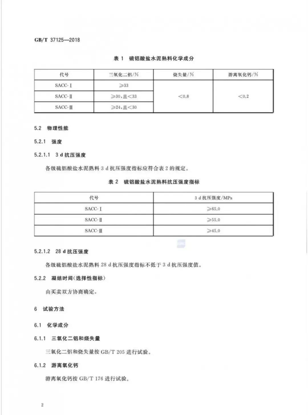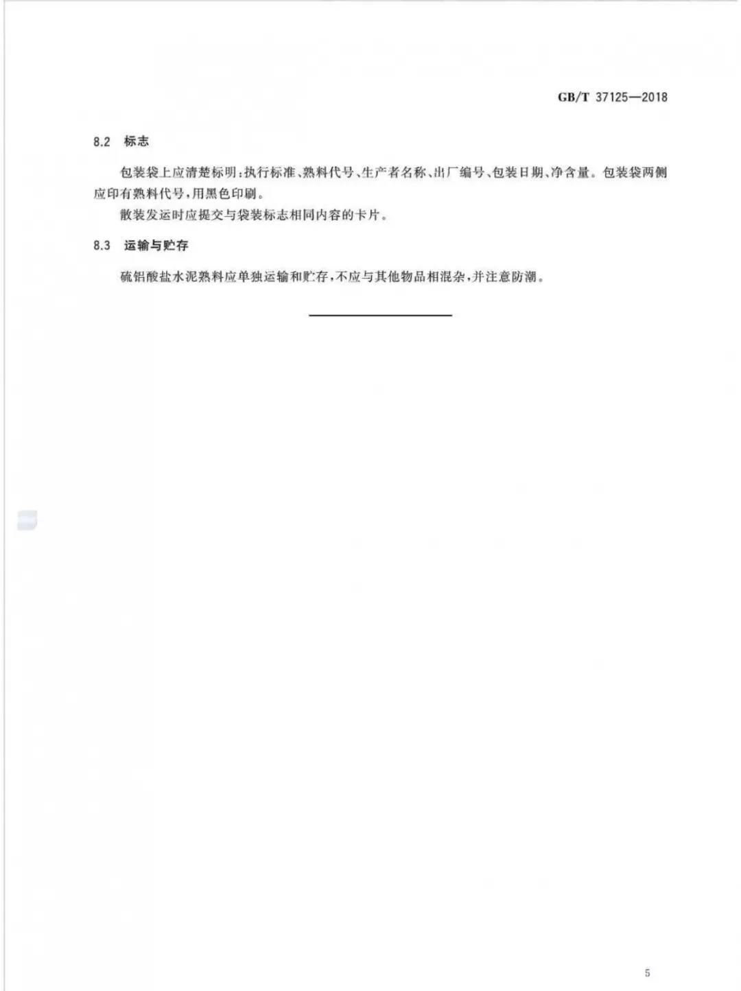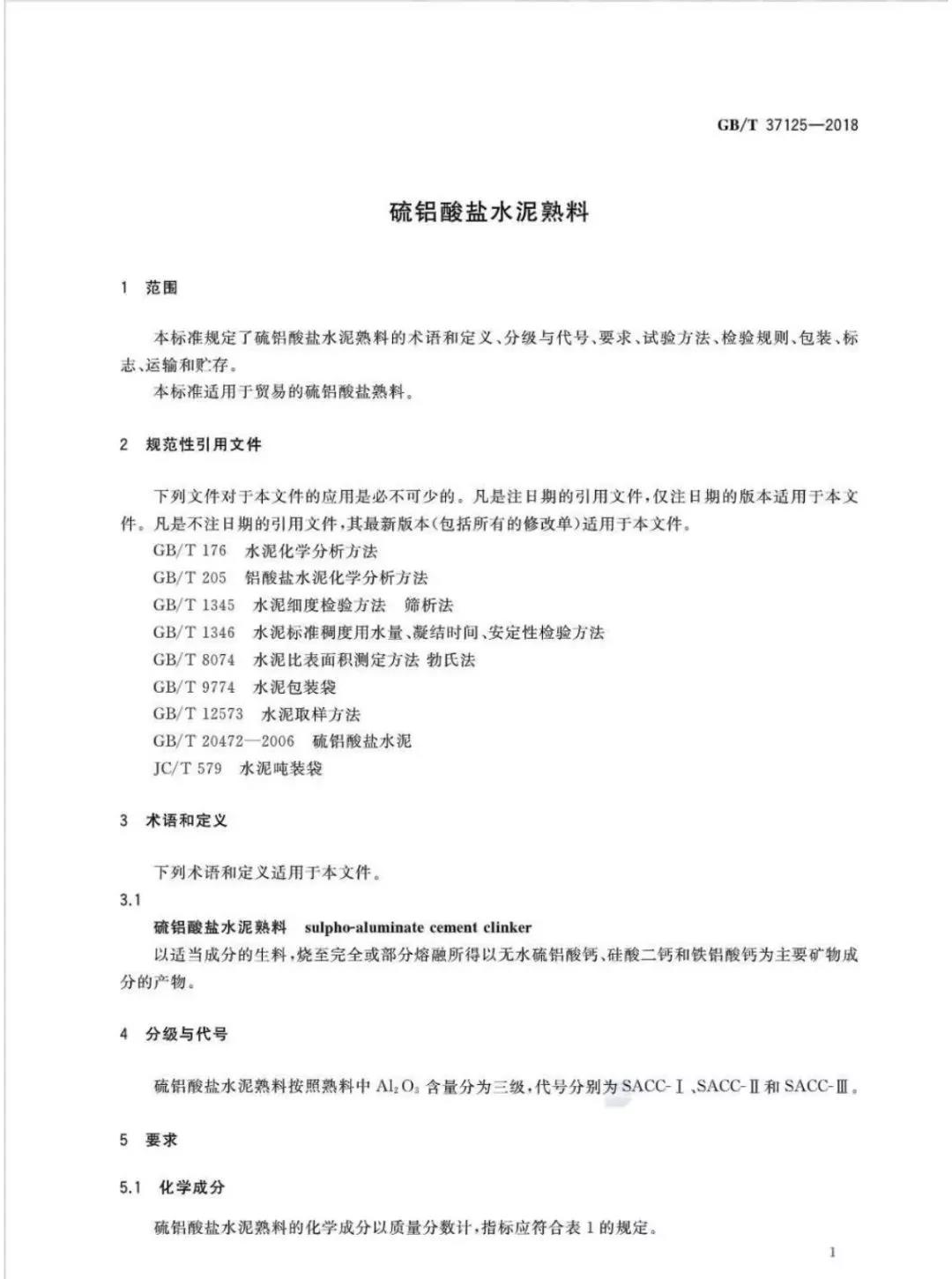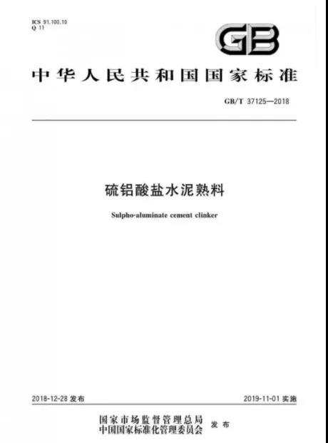 水泥人網(wǎng)消息:于2018年12月28日發(fā)布的GB∕T 37125-2018《硫鋁酸鹽水泥熟料》標(biāo)準(zhǔn)將于2019年11月1日開始實(shí)施。該標(biāo)準(zhǔn)適用于貿(mào)易的硫鋁酸鹽熟料,規(guī)定了硫鋁酸鹽水泥熟料的術(shù)語(yǔ)和定義、分級(jí)與代號(hào)、要求、試驗(yàn)方法、檢驗(yàn)規(guī)則、包裝、標(biāo)志、運(yùn)輸和貯存。