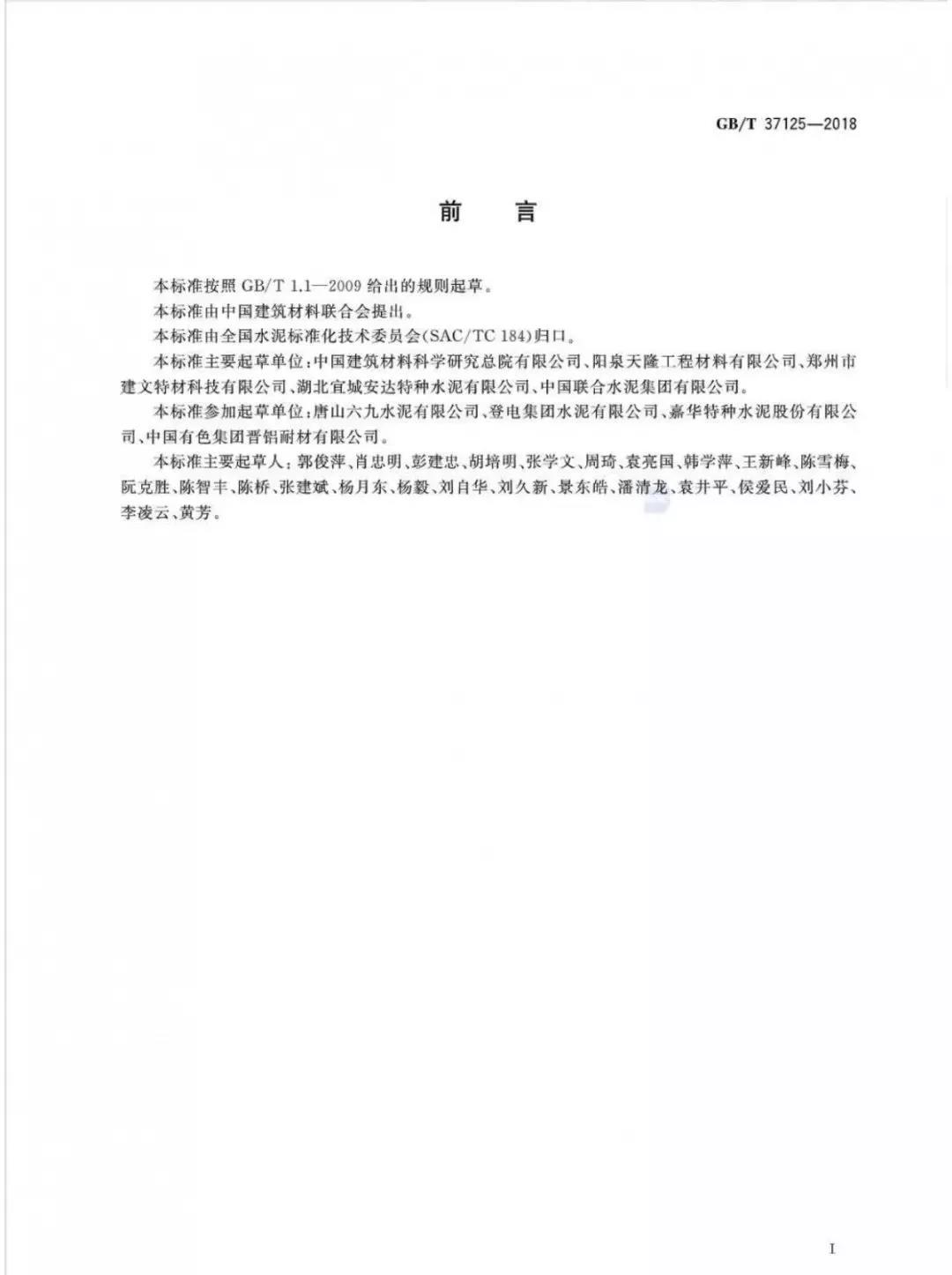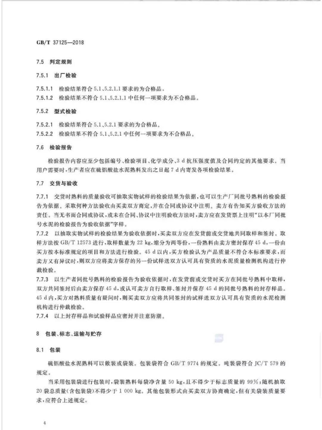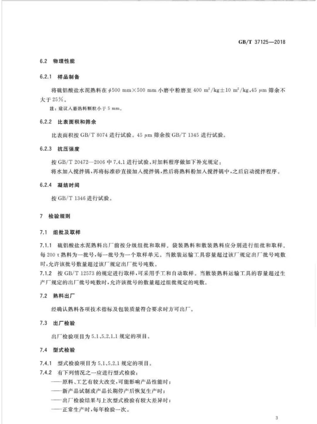 水泥人網(wǎng)消息:于2018年12月28日發(fā)布的GB∕T 37125-2018《硫鋁酸鹽水泥熟料》標(biāo)準(zhǔn)將于2019年11月1日開始實(shí)施。該標(biāo)準(zhǔn)適用于貿(mào)易的硫鋁酸鹽熟料,規(guī)定了硫鋁酸鹽水泥熟料的術(shù)語(yǔ)和定義、分級(jí)與代號(hào)、要求、試驗(yàn)方法、檢驗(yàn)規(guī)則、包裝、標(biāo)志、運(yùn)輸和貯存。