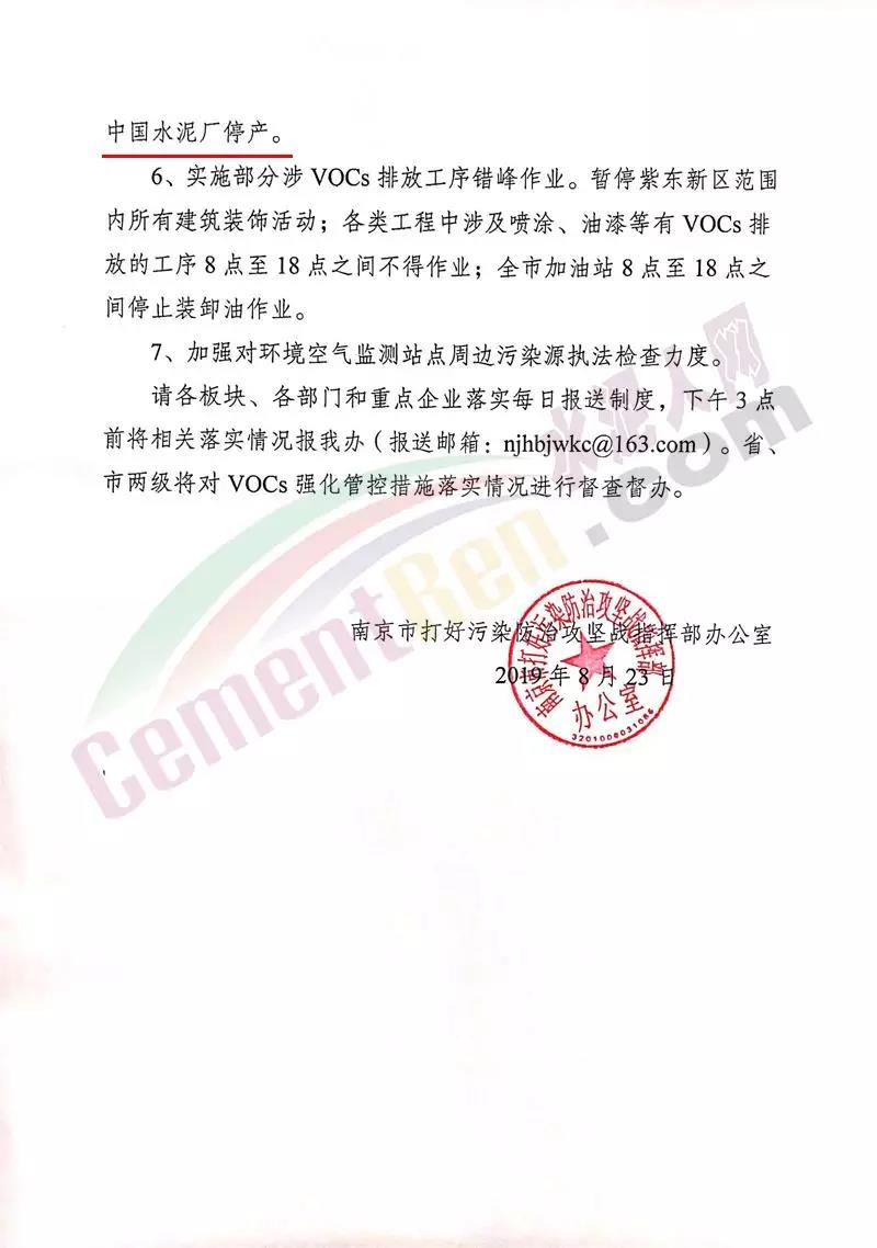 據(jù)水泥人網(wǎng)了解,就在前一日(8月22日),南京市打好污染防治攻堅戰(zhàn)指揮部辦公室發(fā)布《關(guān)于繼續(xù)采取有效措施應(yīng)對大氣污染過程的通知 》稱據(jù)省大氣辦通知,經(jīng)省環(huán)境監(jiān)測中心、省氣象臺預(yù)測,8月23日至24日,受不利氣象條件影響,市空氣質(zhì)量持續(xù)惡化,臭氧8小時滑動平均濃度將超過148微克/立方米。根據(jù)省大氣辦《關(guān)于印發(fā)進一步加在氣污染防治工作方案的通知》要要求,請各板塊在做好民生保障和安全生產(chǎn)基礎(chǔ)上實施強制減排,從22日起繼續(xù)執(zhí)行II級應(yīng)急管控至24日,努力實現(xiàn)臭氧污染“縮時削峰”。省、市兩級將對強化管控措施落實情況進行督查。