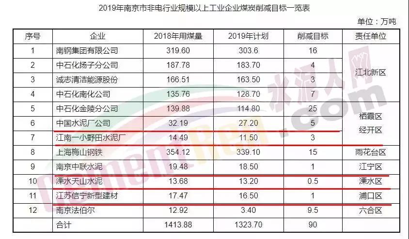 2019年南京市非電行業(yè)規(guī)模以上工業(yè)企業(yè)煤炭削減目標(biāo)一覽表中所列企業(yè)包括中國水泥廠、江南-小野田、南京中聯(lián)水泥、江蘇信寧新型建材、溧水天山水泥等水泥企業(yè)