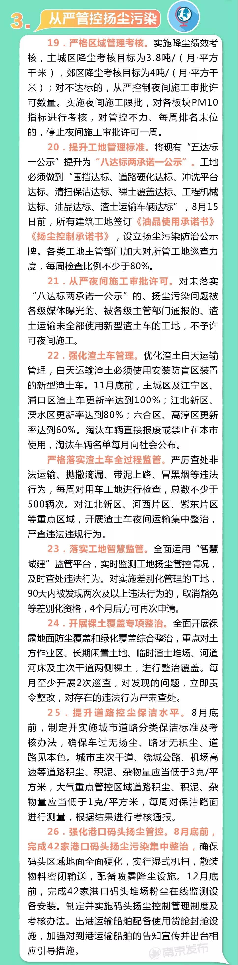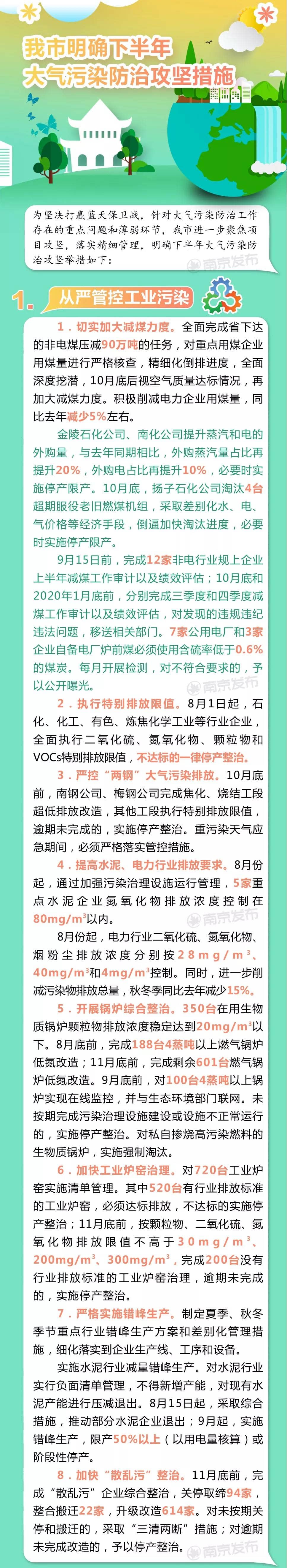 8月9日,南京市出臺《2019年下半年南京市大氣污染防治攻堅措施》堅持“能用盡用、能快則快、能實必實、能嚴(yán)盡嚴(yán)”的原則,針對工業(yè)污染、車船污染、揚塵污染和臭氧污染4項影響南京空氣質(zhì)量的主要污染源 對癥下藥制定了40條從嚴(yán)管控措施 。力爭在本年度剩下的月份提升空氣質(zhì)量讓南京人看到更多藍(lán)天。