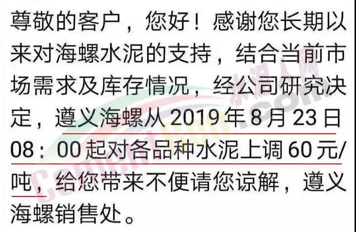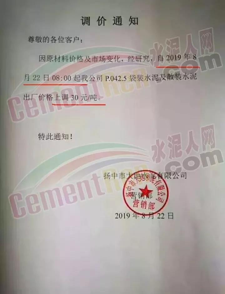 因近期原燃材料成本上漲,我公司現(xiàn)決定于2019年8月22日8:00針對(duì)PO42.5散裝價(jià)格進(jìn)行調(diào)整,價(jià)格上調(diào)60元/噸。