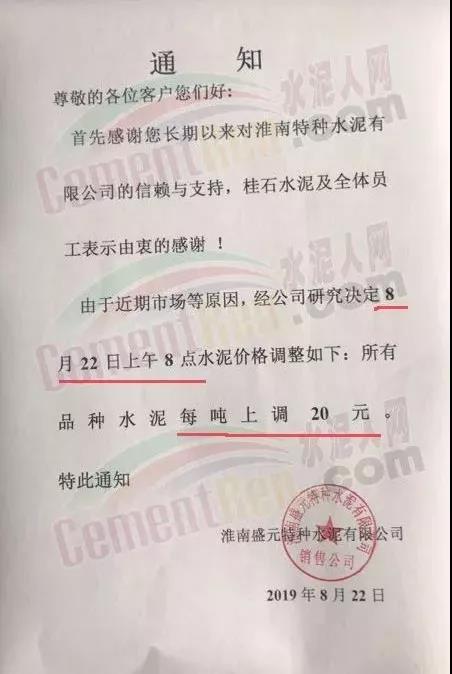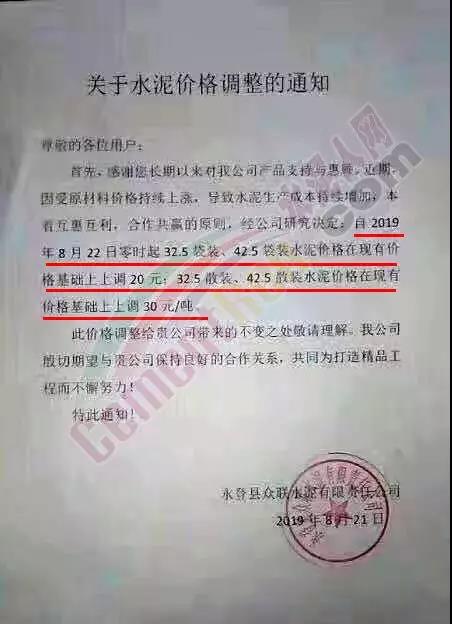經(jīng)公司商議決定自2019年8月22日上午9:30分整,32.5水泥袋裝、散裝每噸上調(diào)10元;42.5水泥袋裝、散裝每噸上調(diào)10元,特此通知!