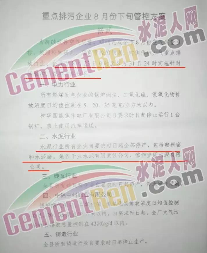 河南省焦作市相關(guān)部門近日發(fā)布的《重點(diǎn)排污企業(yè)8月份下旬管控方案》稱,對(duì)焦作市大氣重點(diǎn)排放行業(yè)、企業(yè)于8月23日0時(shí)至8月31日24時(shí)實(shí)施針對(duì)性管控,水泥行業(yè)所有企業(yè)自要求時(shí)日起全部停產(chǎn),包括熟料窯和水泥磨。