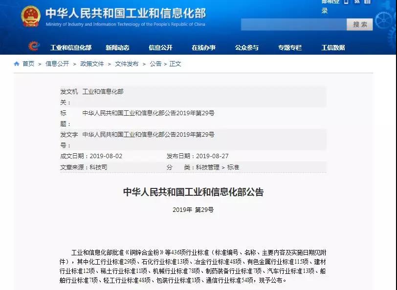 日前,工信部網(wǎng)站發(fā)布了2019年第29號(hào)公告。公告表明,工業(yè)和信息化部批準(zhǔn)《銅鋅合金粉》等436項(xiàng)行業(yè)標(biāo)準(zhǔn)(標(biāo)準(zhǔn)編號(hào)、名稱、主要內(nèi)容及實(shí)施日期見附件),其中化工行業(yè)標(biāo)準(zhǔn)29項(xiàng)、石化行業(yè)標(biāo)準(zhǔn)13項(xiàng)、冶金行業(yè)標(biāo)準(zhǔn)48項(xiàng)、有色金屬行業(yè)標(biāo)準(zhǔn)115項(xiàng)、建材行業(yè)標(biāo)準(zhǔn)12項(xiàng)、稀土行業(yè)標(biāo)準(zhǔn)11項(xiàng)、機(jī)械行業(yè)標(biāo)準(zhǔn)78項(xiàng)、制藥裝備行業(yè)標(biāo)準(zhǔn)7項(xiàng)、汽車行業(yè)標(biāo)準(zhǔn)13項(xiàng)、船舶行業(yè)標(biāo)準(zhǔn)7項(xiàng)、輕工行業(yè)標(biāo)準(zhǔn)48項(xiàng)、包裝行業(yè)標(biāo)準(zhǔn)1項(xiàng)、通信行業(yè)標(biāo)準(zhǔn)54項(xiàng),現(xiàn)予公布。