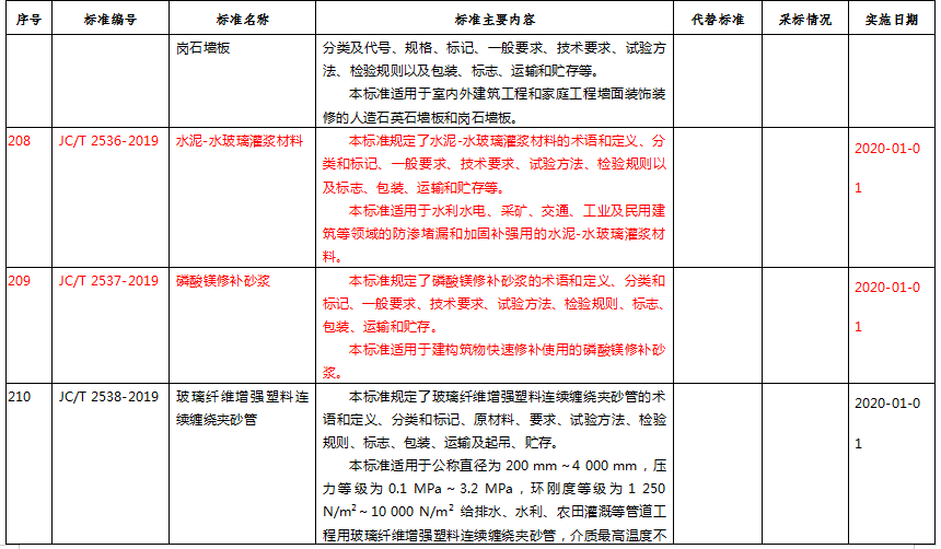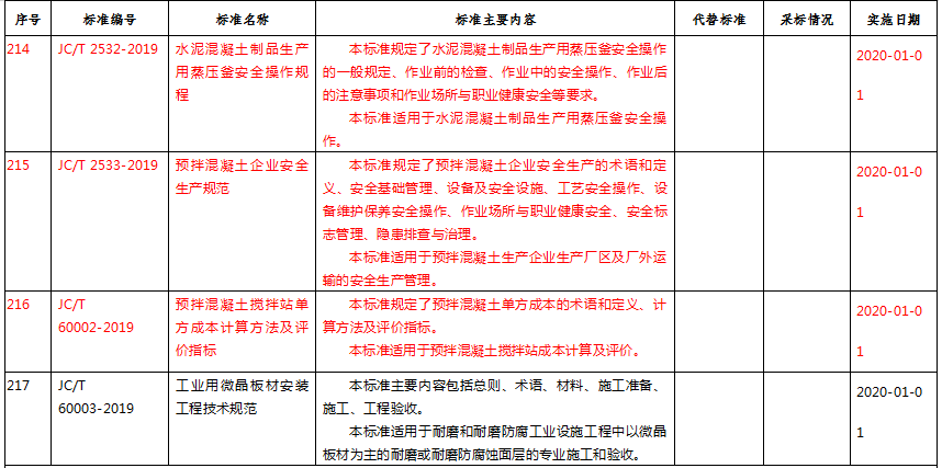 水泥行業(yè):標(biāo)準(zhǔn)編號(hào)為JC/T 2536-2019的水泥-水玻璃灌漿材料;標(biāo)準(zhǔn)編號(hào)為JC/T 2537-2019的磷酸鎂修補(bǔ)砂漿;標(biāo)準(zhǔn)編號(hào)為JC/T 2532-2019的水泥混凝土制品生產(chǎn)用蒸壓釜安全操作規(guī)程;標(biāo)準(zhǔn)編號(hào)為JC/T 2533-2019的預(yù)拌混凝土企業(yè)安全生產(chǎn)規(guī)范;標(biāo)準(zhǔn)編號(hào)為JC/T 60002-2019的預(yù)拌混凝土攪拌站單方成本計(jì)算方法及評(píng)價(jià)指標(biāo);這些標(biāo)準(zhǔn)被工信部批準(zhǔn),并且上述這些標(biāo)準(zhǔn)實(shí)施日期都是2020年1月1日。
