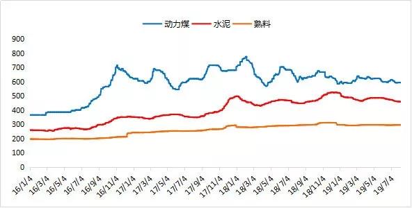 圖2:國內(nèi)動力煤、熟料、水泥價格走勢圖(單位:元/噸)