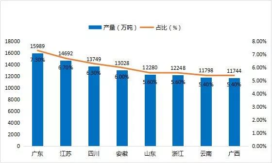 從圖4國內(nèi)來看,國內(nèi)水泥和熟料產(chǎn)量增速區(qū)域特點(diǎn)主要呈現(xiàn)“南部略強(qiáng),北部偏弱”的特點(diǎn),從區(qū)域劃分來看,國內(nèi)水泥生產(chǎn)主要分布在華東、中南、西南三個區(qū)域,其中華東地區(qū)占比最大。分省市來看,2018年國內(nèi)水泥生產(chǎn)前八大省市為廣東、江蘇、四川、安徽、山東、浙江、云南、廣西,其中廣東省2018年產(chǎn)量最高為15989萬噸,占比7.3%,江蘇、四川緊隨其后,分別占比6.7%、6.3%。