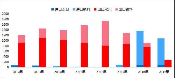 進(jìn)口方面:2012-2016年,國內(nèi)進(jìn)口熟料和水泥數(shù)量微乎其微,但從供給側(cè)改革以來,水泥限產(chǎn)明顯,且價格持續(xù)上漲,國外熟料不斷進(jìn)入國內(nèi)水泥市場,如越南的水泥和熟料開始大量進(jìn)入中國沿海地區(qū);2017年國內(nèi)熟料和水泥進(jìn)口數(shù)量猛增87.1萬噸,2018年進(jìn)口量高達(dá)1362.55萬噸,反高于出口總量459萬噸;2019年上半年國內(nèi)進(jìn)口熟料和水泥量持續(xù)增加,進(jìn)口量累計1082.52萬噸,同比增漲143.48%。進(jìn)口熟料不僅來自越南,包括印尼在內(nèi)的東南亞其他水泥產(chǎn)能過剩的國家也不斷進(jìn)入國內(nèi)沿海水泥市場。