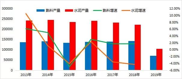 2019年上半年,國內(nèi)熟料總產(chǎn)量7.1億噸,水泥總產(chǎn)量10.45億噸,同比增長4.8%,水泥產(chǎn)量增速創(chuàng)出近6年來同期新高。從以上數(shù)據(jù)來看,預(yù)計2019年全年熟料和水泥總量或?qū)⑴c2018年持平。