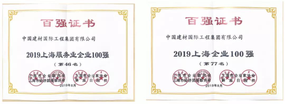 中國建材工程榮獲2019“上海企業(yè)100強”及“上海服務(wù)業(yè)企業(yè)100強”稱號