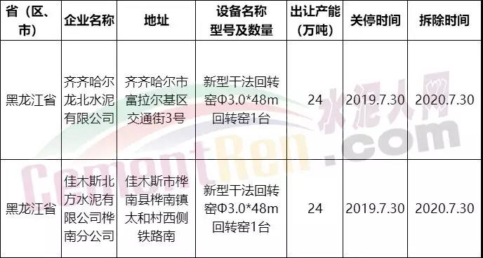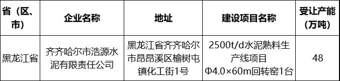 上述文件顯示,受讓產(chǎn)能企業(yè)為位于黑龍江省齊齊哈爾市昂昂溪區(qū)榆樹(shù)屯鎮(zhèn)化工街1號(hào)的齊齊哈爾市浩源水泥有限責(zé)任公司,建設(shè)項(xiàng)目為2500t/d水泥熟料生產(chǎn)線項(xiàng)目(關(guān)鍵設(shè)備為Φ4.0×60m回轉(zhuǎn)窯1臺(tái))。出讓產(chǎn)能企業(yè)為齊齊哈爾龍北水泥有限公司和佳木斯北方水泥有限公司樺南分公司兩家企業(yè)。這兩家企業(yè)將于明年7月底前拆出退出。