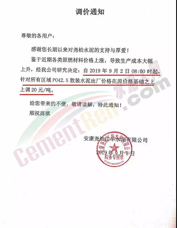 鄭州永華水泥有限公司發(fā)布調(diào)價函稱因原材料持續(xù)上漲和外部等因素影響,經(jīng)公司研究決定,自2019年9月1日7:30起,各品種水泥在原價格基礎(chǔ)上,統(tǒng)一上調(diào)20元/噸。