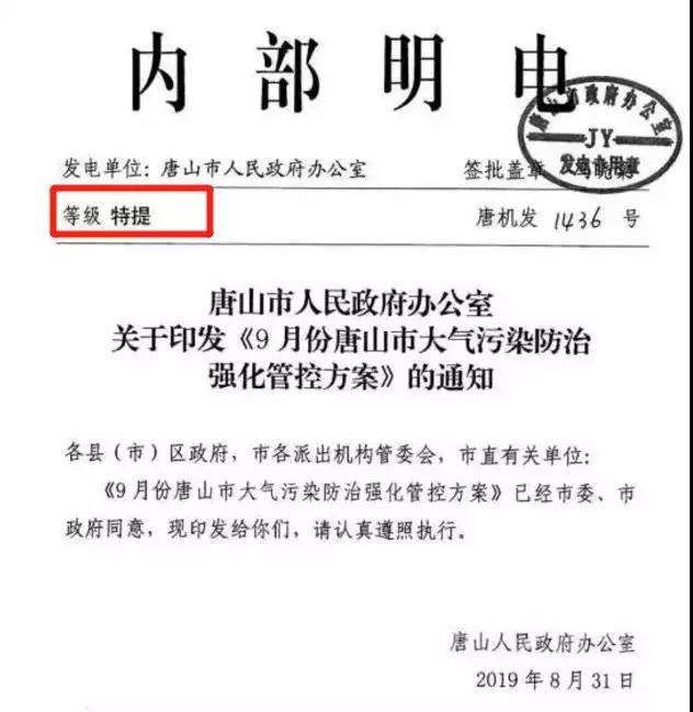 近日,唐山市人民政府發(fā)布《9月份唐山市大氣污染防治強化管控方案》的特提文件。該文件對于當地鋼鐵、焦化、水泥、玻璃等工業(yè)企業(yè)的錯峰時間進行了明確的要求。而該文件與以往最大的區(qū)別,他是一份水泥行業(yè)非常少見的特提文件,那特提文件與其他文件的區(qū)別又是什么呢?據水泥人網了解, 為了確保公文的時效性,使緊急事項得以及時處理,對緊急公文必須注明緊急程度.,在公文中分別標明”特提,特急,加急,平急” 從左到右緊急程度依次降低.,特提屬于最高級。“特提”文件需要馬上辦理,要求一天之內辦完;而“特急”文件需在8小時內閱辦,是要求三天之內辦完;“加急”文件需在24小時內閱辦,是要求五天之內辦完。這足以看出此次停產的重要性和緊迫性?!?br />