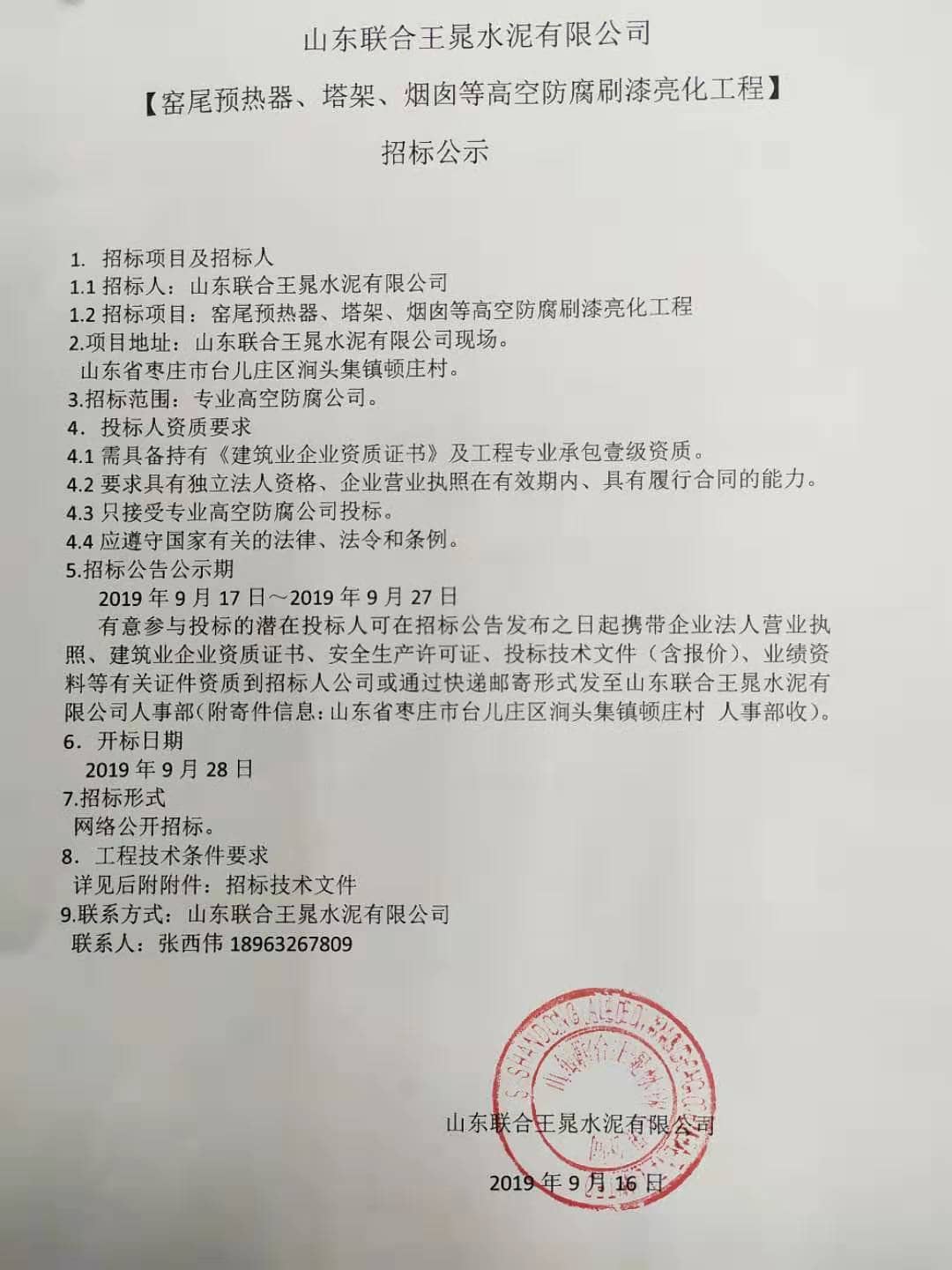 據(jù)水泥人網(wǎng)消息,近日山東聯(lián)合王晁水泥有限公司委托水泥人網(wǎng)針對(duì)窯尾預(yù)熱器、塔架、煙囪、窯門罩等防腐、高空刷漆、亮化工程招標(biāo)。