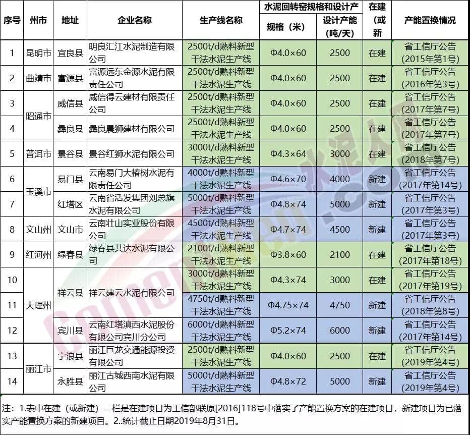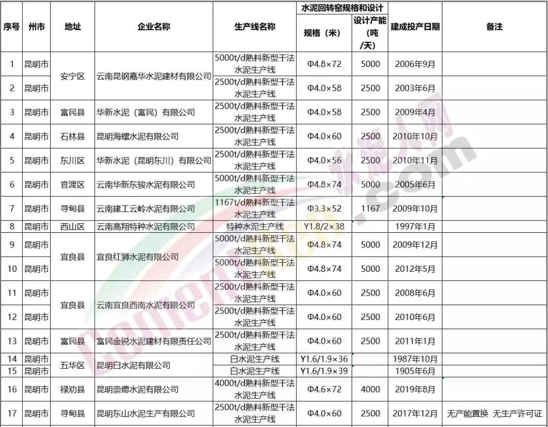 一、云南省在建新建水泥熟料生產(chǎn)線清單新建、在建水泥熟料生產(chǎn)線包括:威信得云建材有限責(zé)任公司、彝良晨獅建材有限公司、景谷紅獅水泥有限公司、云南易門大椿樹(shù)水泥有限責(zé)任公司、云南省活發(fā)集團(tuán)劉總旗水泥有限公司、云南壯山實(shí)業(yè)股份有限公司、綠春縣共達(dá)水泥有限公司、祥云建云水泥有限公司、云南紅塔滇西水泥股份有限公司賓川分公司、麗江巨龍交通能源投資有限公司、麗江古城西南水泥有限公司等13家企業(yè)14條生產(chǎn)線。其中涉及祥云建云水泥有限公司在建項(xiàng)目、新建項(xiàng)目各一條生產(chǎn)線。詳情如下: