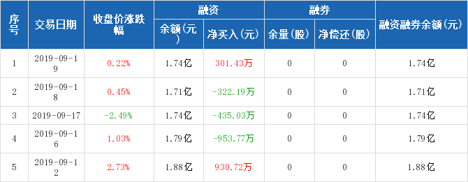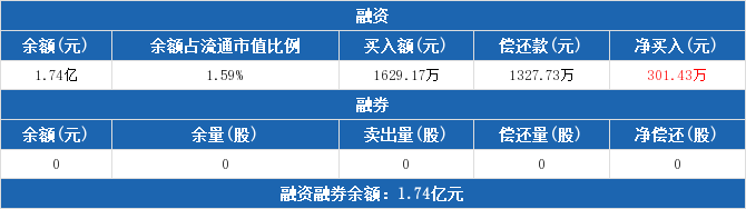 融資方面,當(dāng)日融資買入1629.17萬(wàn)元,融資償還1327.73萬(wàn)元,融資凈買入301.43萬(wàn)元。融券方面,融券賣出0股,融券償還0股,融券余量0股,融券余額0元。融資融券余額合計(jì)1.74億元。