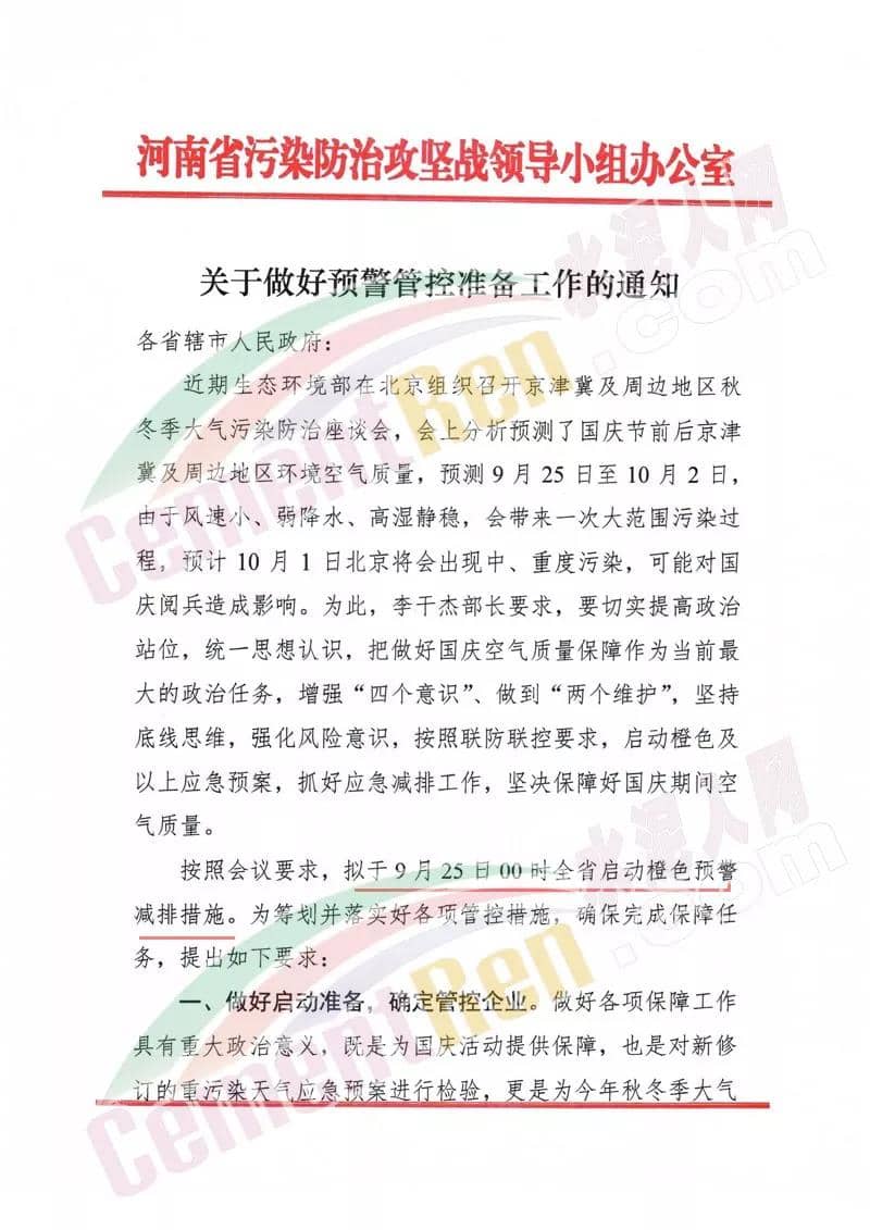 同期,河南省污染防治攻堅(jiān)戰(zhàn)領(lǐng)導(dǎo)小組辦公室發(fā)布《關(guān)于做好預(yù)警管控準(zhǔn)備工作的通知》稱,擬于9月25日0時(shí)全省啟動(dòng)橙色預(yù)警減排措施。通知全文如下: