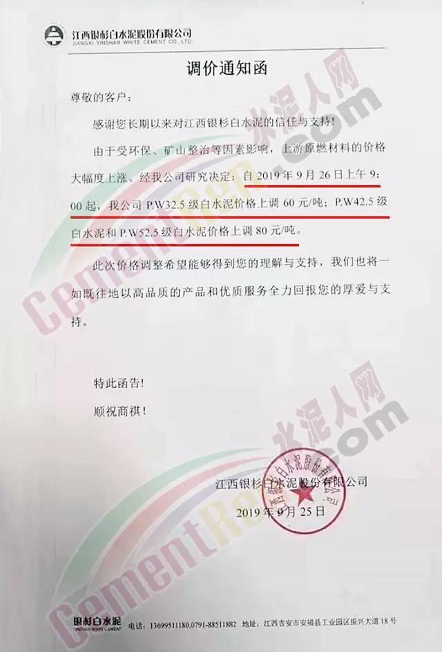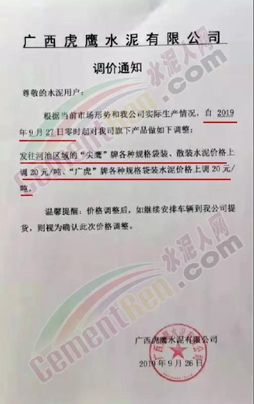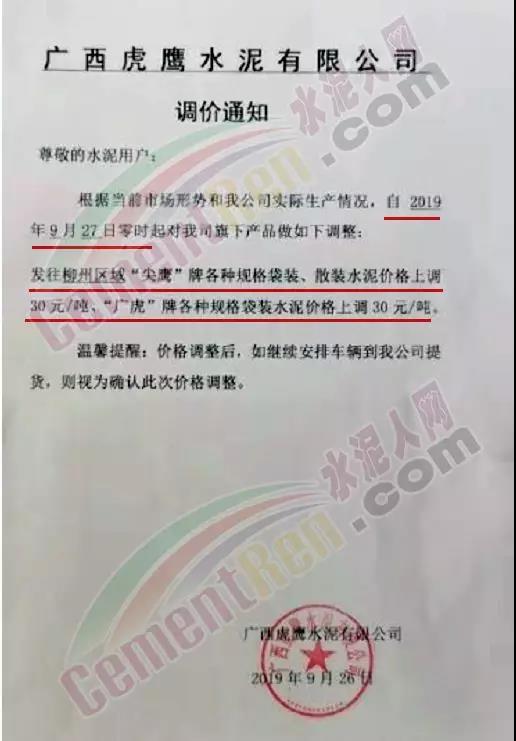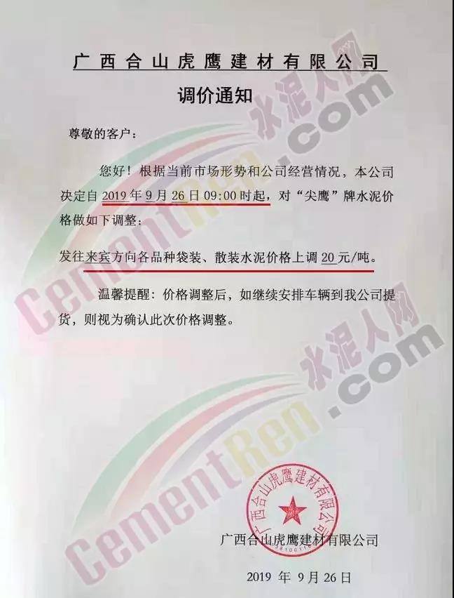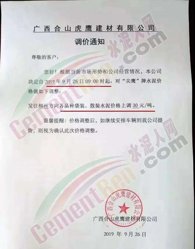 由于原材料價格上漲,公司經營成本上升,結合當前市場行情變化,經公司研究決定于2019年9月26日8:00開始對隆回區(qū)域各品種水泥價格上調30元/噸。