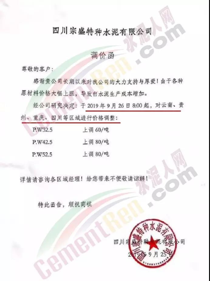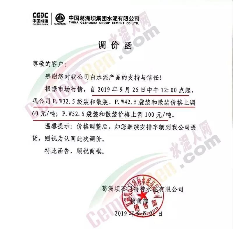 根據當前市場形勢及我司生產情況,我公司決定于2019年9月26日8時,上調所有品種袋裝、散裝水泥價格30元/噸。價格上調以我司出廠過磅時間為準,如您繼續(xù)安排提貨,則視為認同此次價格調整。順祝商祺!
