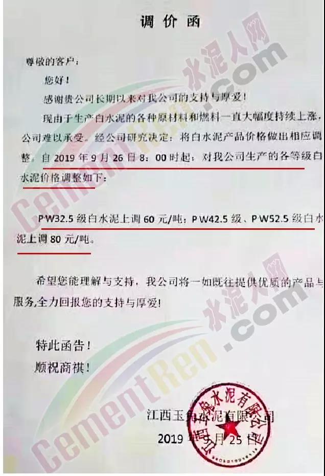 江西玉免水泥有限公司調價函稱,由于生產白水泥的各種原材料一直大幅持續(xù)上漲,公司難以承受。經公司研究決定,將白水泥價格做出相應調整。自9月26日早8時起,對公司生產的各等級白水泥價格進行調整,上調幅度60-80元/噸。