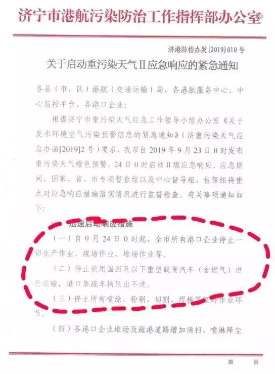 據(jù)水泥人網(wǎng)了解,近期北京、天津、河南、河北、山東、山西、江蘇、安徽均發(fā)布了橙色及以上重污染天氣預(yù)警。要求區(qū)域內(nèi)相關(guān)企業(yè)單位停工、停產(chǎn)、停運(yùn),同時(shí)要求相關(guān)港口停止作業(yè)。山東省多家港口企業(yè)停止作業(yè),港口集疏車輛只進(jìn)不出。自9月24日起,濟(jì)寧市所有港口企業(yè)停止一切生產(chǎn)作業(yè)、煤場作業(yè)、堆場作業(yè),同時(shí)停止使用國四及以下重型載貨汽車(含燃?xì)?進(jìn)行運(yùn)輸,港口集疏車輛只進(jìn)不出。
