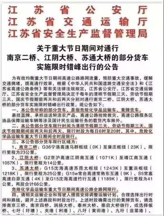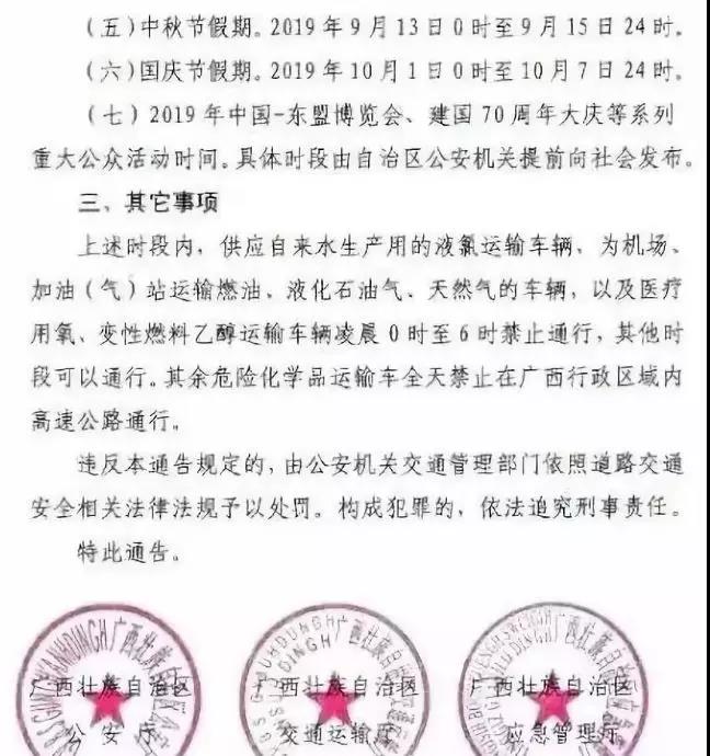 湖南?。喝〗形kU(xiǎn)品車輛2019年10月1日0時(shí)至2019年10月8日6時(shí),湖南全省高速公路禁止危險(xiǎn)化學(xué)品運(yùn)輸車輛通行。