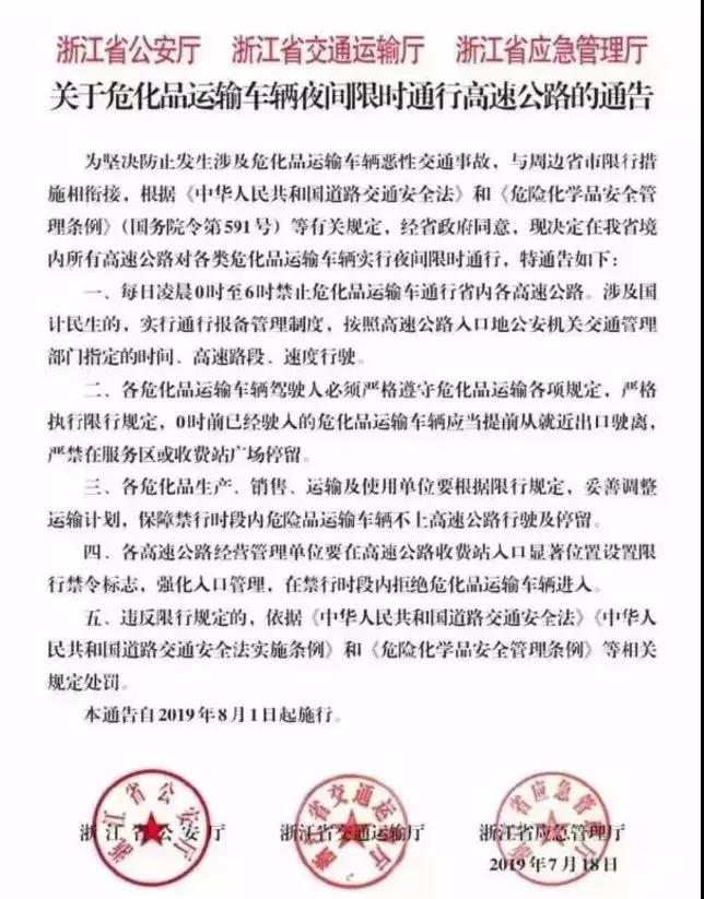 2019年8月1日起,每日0時(shí)至6時(shí)全省高速公路禁止危險(xiǎn)化學(xué)品運(yùn)輸車輛通行,其他時(shí)間段不限行。
