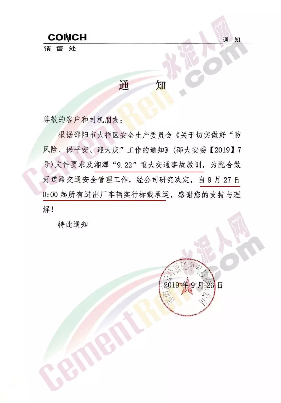 9月26日邵陽市海螺水泥銷售處曾發(fā)通知稱:為配合邵陽市大祥區(qū)安委會文件要求及湘潭“9.22”重大交通事故教訓,配合做好道路交通安全管理工作。經(jīng)研究決定自27日0點起所有進出廠車輛實行標載。