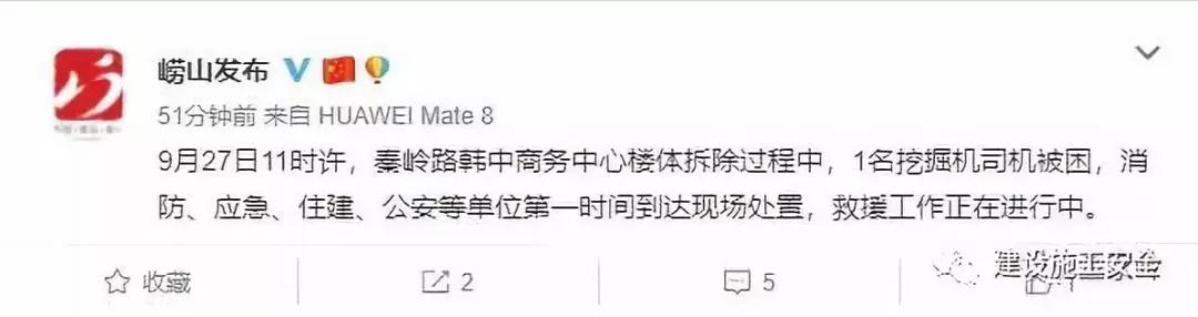 微博內容截圖據(jù)嶗山發(fā)布官方微博發(fā)布消息稱,9月27日11時許,青島市嶗山區(qū)秦嶺路韓中商務中心樓體拆除過程中,1名挖掘機司機被困,消防、應急、住建、公安等單位第一時間到達現(xiàn)場處置,救援工作正在進行中。 據(jù)知情人透露,該項目的拆除工作是由和達集團進行施工,現(xiàn)場突發(fā)意外整個樓體瞬間崩塌,挖掘機被埋。事故現(xiàn)場正進行多方救援