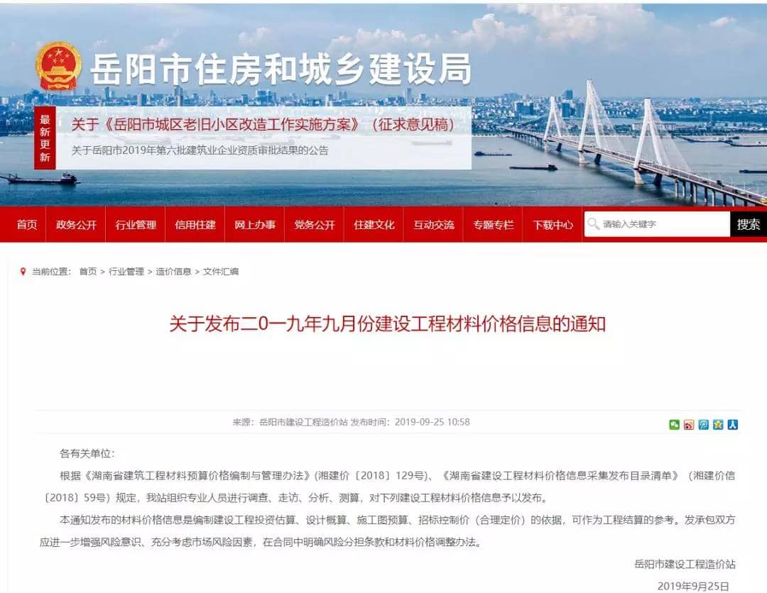 岳陽市二0一九年九月份建設(shè)工程材料價格