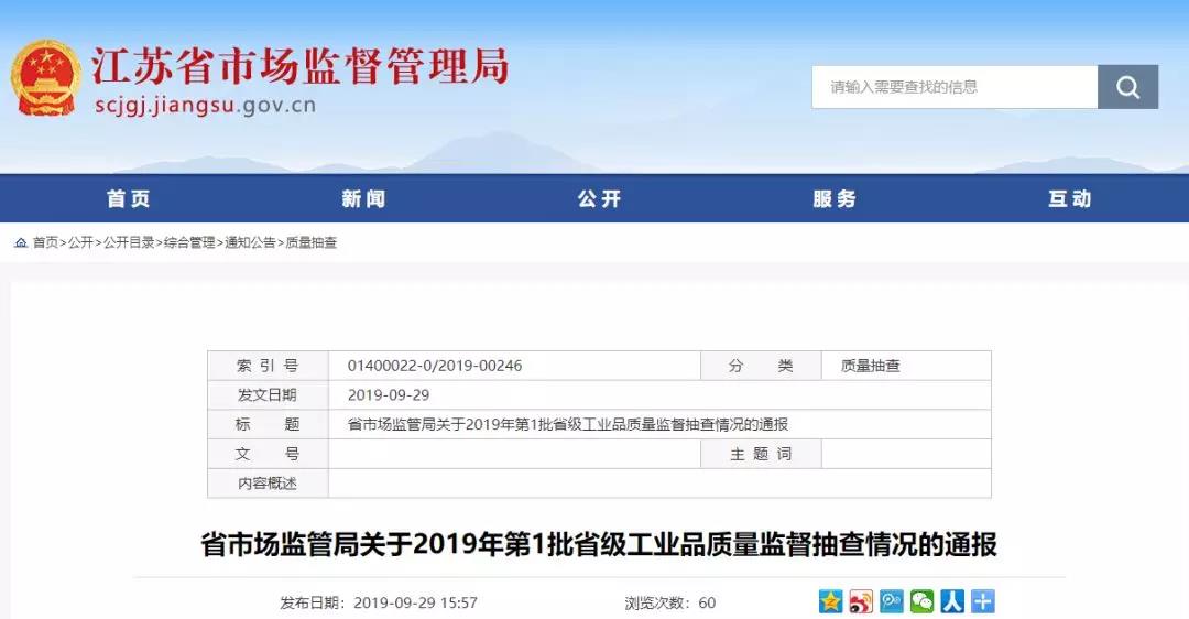 日前,江蘇省市場(chǎng)監(jiān)督管理局網(wǎng)站發(fā)布關(guān)于2019年第1批省級(jí)工業(yè)品質(zhì)量監(jiān)督抽查情況的通報(bào)。