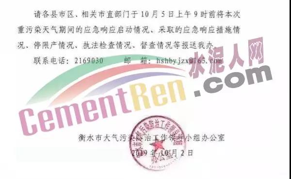 據(jù)水泥人網(wǎng)消息,衡水市大氣污染防治工作領(lǐng)導(dǎo)小組辦公室發(fā)布《關(guān)于解除重污染天氣II級(橙色)應(yīng)急響應(yīng)的通知》稱,根據(jù)《關(guān)于解除重污染天氣II級應(yīng)急響應(yīng)的通知》(冀氣領(lǐng)辦【2019】195號)的精神,經(jīng)省環(huán)境應(yīng)急與重污染天氣預(yù)警中心與中國環(huán)境監(jiān)測總站、省環(huán)境氣象中心聯(lián)合會商,預(yù)計(jì)10月3日夜間起,西北冷空氣自北向南影響河北省,污染逐步清除。預(yù)計(jì)4日衡水市本次污染過程基本結(jié)束,按上級要求,經(jīng)衡水市大氣污染防治工作領(lǐng)導(dǎo)小組批準(zhǔn),衡水市定于10月4日8時(shí)解除本次重污染天氣應(yīng)急響應(yīng)?! ≡娜缦拢?img alt="" src="http://www.gzhcccc.com/uploadfile/2019/1008/20191008042054297.jpg" />