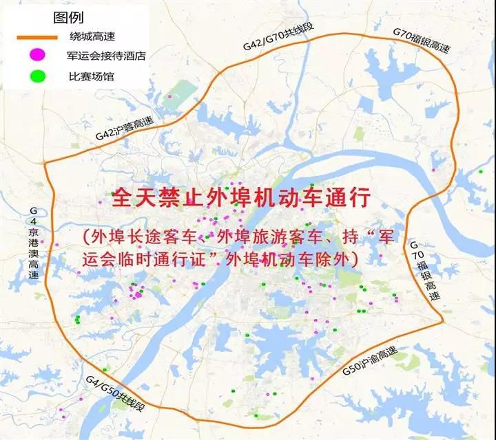 危爆物品運(yùn)輸車限行、禁行關(guān)于外埠機(jī)動車,武漢市繞城高速公路以內(nèi)的區(qū)域(不含繞城高速公路)全天禁止外埠機(jī)動車通行,外埠長途客車、外埠旅游客車、持“軍運(yùn)會臨時通行證”的外埠機(jī)動車除外。