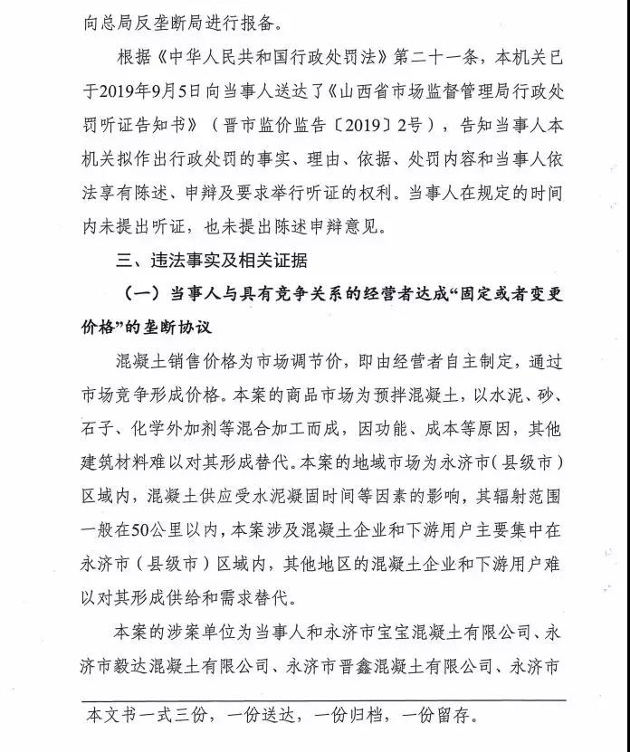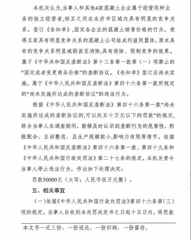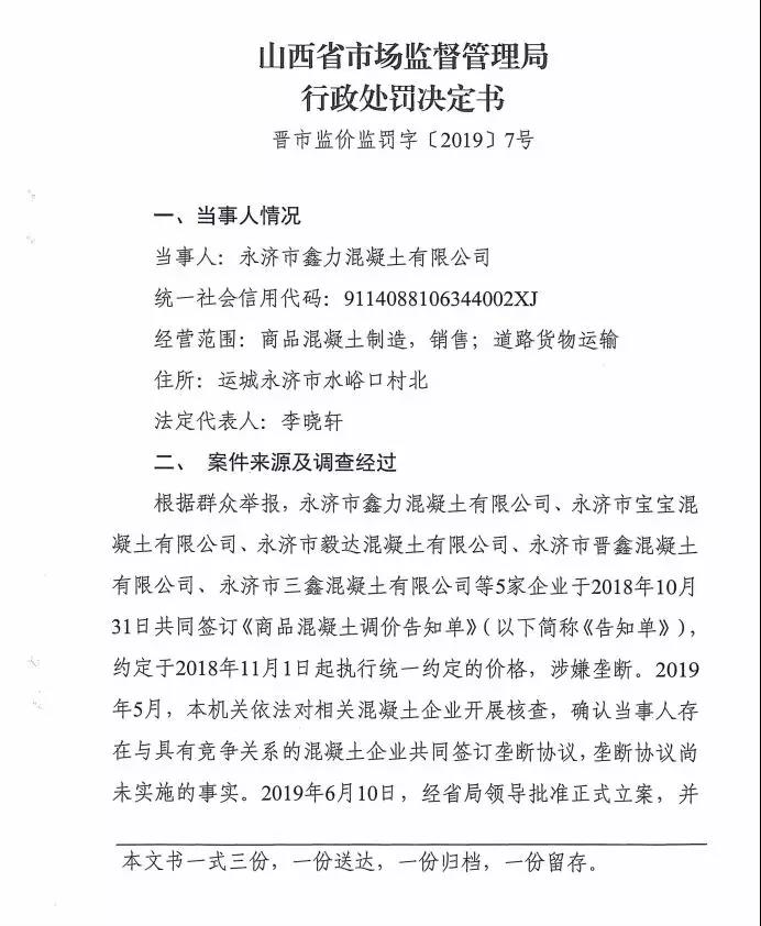 第7號處罰決定書提到根據(jù)群眾舉報,永濟市鑫力混凝土有限公司、永濟市寶寶混凝土有限公司、永濟市毅達混凝土有限公司、永濟市晉鑫混凝土有限、永濟市三鑫混凝土有限公司等五家企業(yè)于上年10月31日共同簽訂《商品混凝土調價告知單》約定于當年11月1日起執(zhí)行統(tǒng)一約定的價格,涉嫌壟斷。
