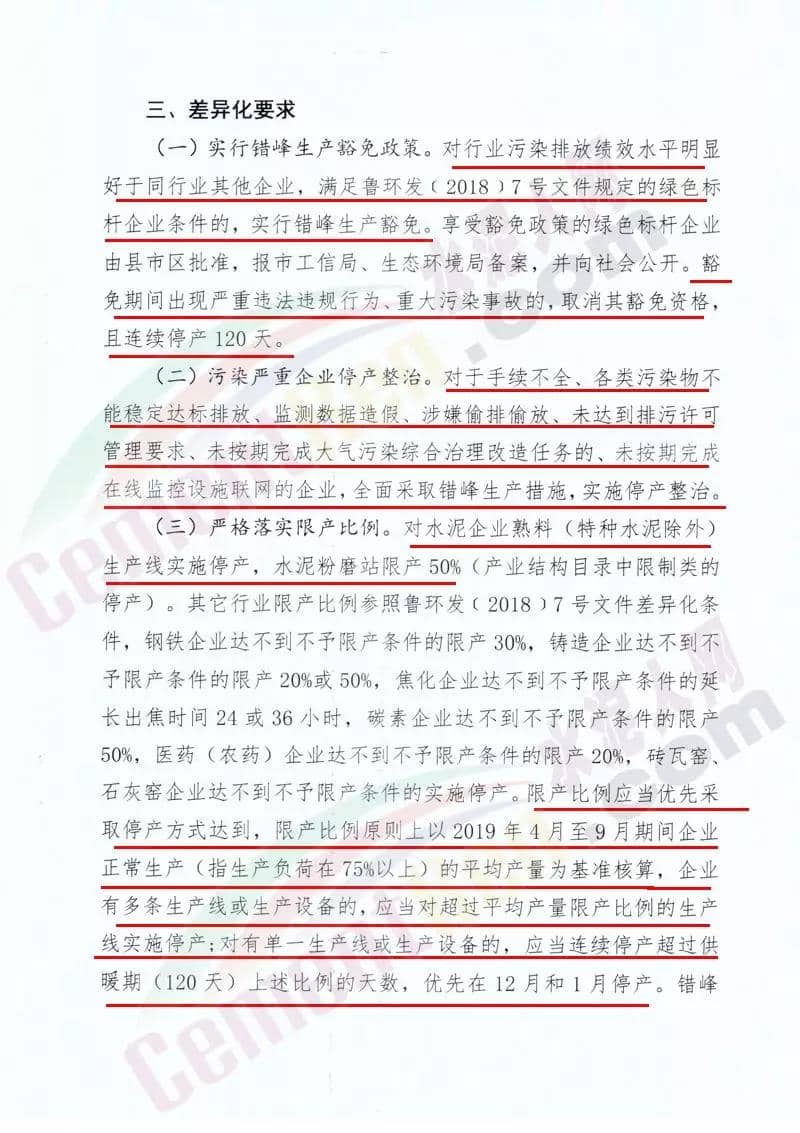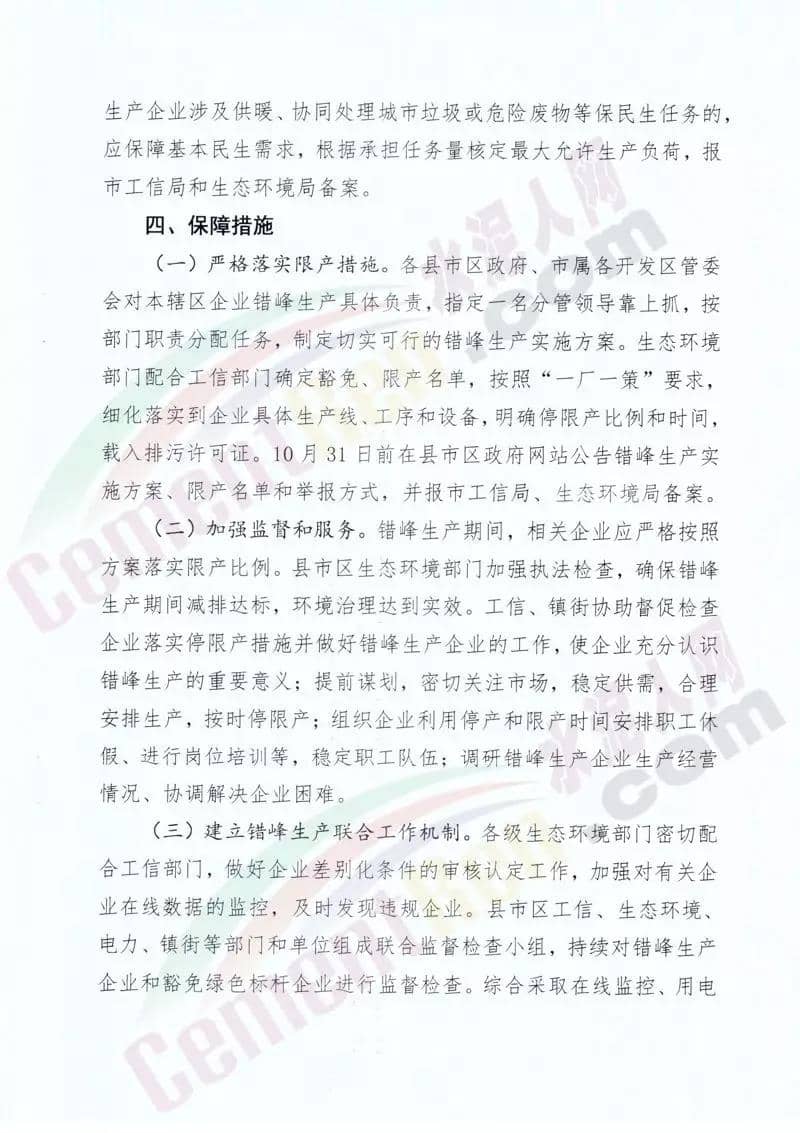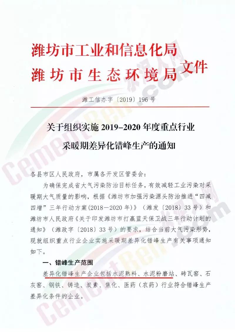 水泥人網(wǎng)消息:山東濰坊市工信局,維坊市生態(tài)環(huán)境局聯(lián)合發(fā)布《關(guān)于組織實施2019-2020年度重點行業(yè)采暖期差異化錯峰生產(chǎn)的通知 》。通知稱:差異化錯峰生產(chǎn)企業(yè)包括 水泥熟料、水泥粉磨站等。對行業(yè)污染排放績效水平明顯好于同行業(yè)其他 企業(yè)滿綠色標桿企業(yè)條件的實施錯峰生產(chǎn)豁免。對水泥企業(yè)熟料生產(chǎn)線實施停產(chǎn),水泥粉磨站限產(chǎn)50%。通知原文如下: